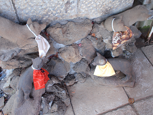 本殿(?)の脇にあった小さなお社の足元に、狐さんが。前掛けかわいい...